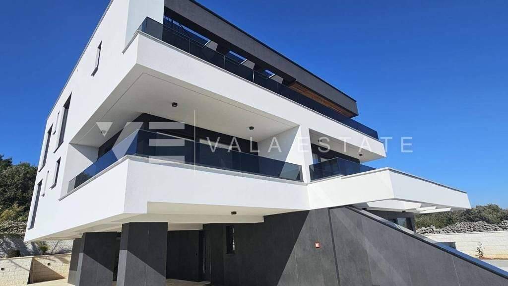 Immobilien Insel Krk, Krk - zum Verkauf steht eine Luxuswohnung im ersten Stock eines Familienhauses mit insgesamt vier Wohneinheiten. Die Wohnungsfläche von 73.75 m2 verteilt sich auf Eingangshalle, Speisekammer, Schlafzimmer, Bad, Küche mit Wohnzimmer und große Terrasse von 15,23 m2. Die Wohnung verfügt über einen Abstellraum von 5,62 m2 und zwei Parkplätze. Top-Bauweise und -Ausstattung mit Materialauswahl, Fußbodenheizung mit Wärmepumpe, ALU-Tischlerei und Klimaanlage aller Räume. Es befindet sich in ruhiger Lage, 600 m vom Meer und schönen Stränden und etwa 800 m vom Zentrum und allen Annehmlichkeiten entfernt.