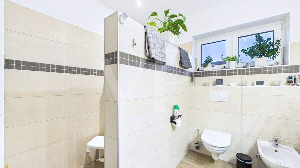 Das Badezimmer präsentiert sich funktional und zeitlos gestaltet und fügt sich harmonisch in das komfortable Gesamtbild der Immobilie ein. Die ebenerdige Bauweise ermöglicht barrierearmes Wohnen und macht den Bungalow besonders zukunftssicher.