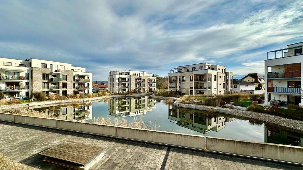 Der große überdache Balkon lädt zum Verweilen im Freien ein und bietet einen seitlichen Blick auf den künstlich angelegten See, welcher ein echtes Highlight der Wohnanlage ist und Urlaubsfeeling nach Hause bringt.