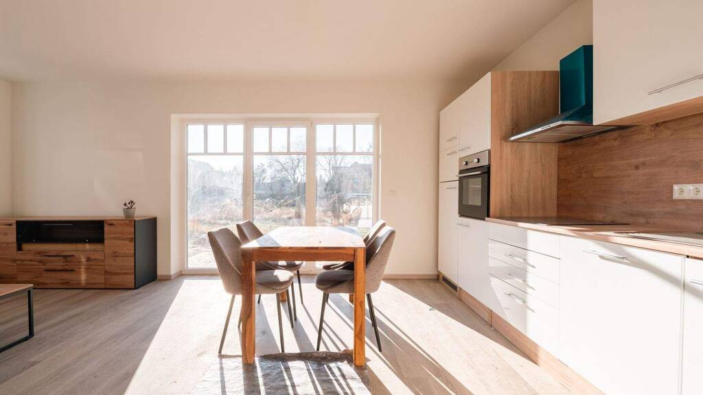 Der offen gestaltete Wohn- und Kochbereich bildet das Herzstück der Wohnung. Großzügige Fensterflächen lassen viel Tageslicht herein und schaffen eine freundliche, offene Atmosphäre. Von hier aus gelangen Sie direkt auf die sonnige Terrasse mit Südausrichtung - ein echter Mehrwert, der lange Sonnenstunden verspricht. Ob Frühstück im Freien, entspanntes Lesen oder ein Glas Wein am Abend: Hier genießen Sie Licht, Wärme und Ruhe gleichermaßen.