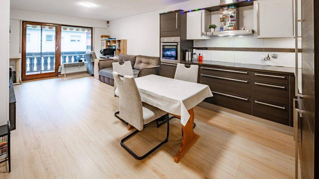 Der Wohn- und Kochbereich bildet das Herzstück der Wohnung. Hier ist die Küche offen integriert und mit Spülbecken, Geschirrspüler, Cerankochfeld, Backofen sowie einem Einbaukühlschrank mit Tiefkühlfach ausgestattet. Der Raum wirkt hell, einladend und eignet sich ideal für gemeinsames Kochen, Essen und entspannte Abende.