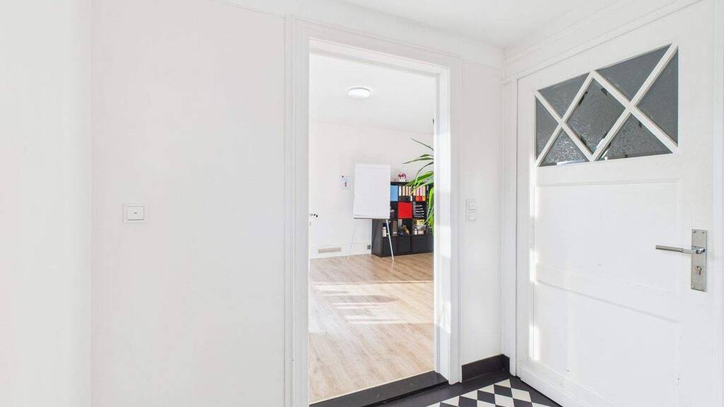 Die vorderen Büroräume verfügen über eine altbautypisch höhere Deckenhöhe, glatt verputzte und weiß gestrichene Wände und einen Vinyl-Design-Belag in Holzoptik.