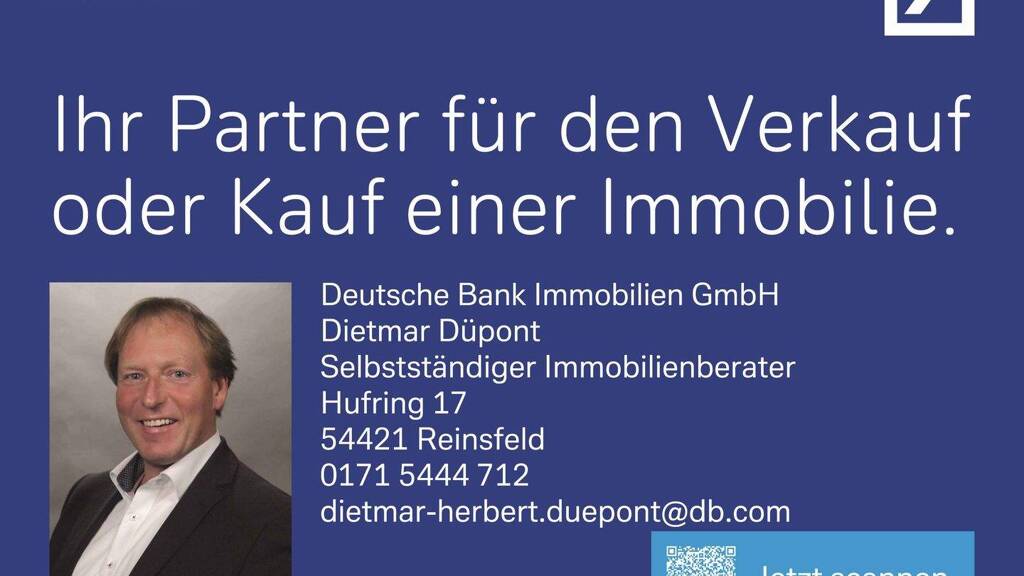 Sollten Sie Fragen zur Finanzierung haben, zögern Sie nicht, uns anzurufen oder eine E-Mail an dietmar-herbert.duepont@db.com zu senden. Wir vermitteln Sie gerne an einen unserer Baufinanzierungsexperten, der Ihre individuellen Finanzierungswünsche persönlich oder per Zoom mit Ihnen bespricht, um Ihnen eine maßgeschneiderte Finanzierung zu ermöglichen.
