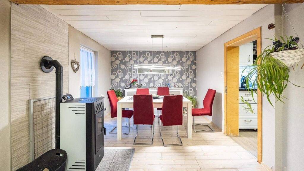 - OG: 3-Zimmer- Wohnung (ca. 159 m²) mit modernisiertem Bad mit Badewanne, Balkon. Geheizt wird mit Kaminofen.