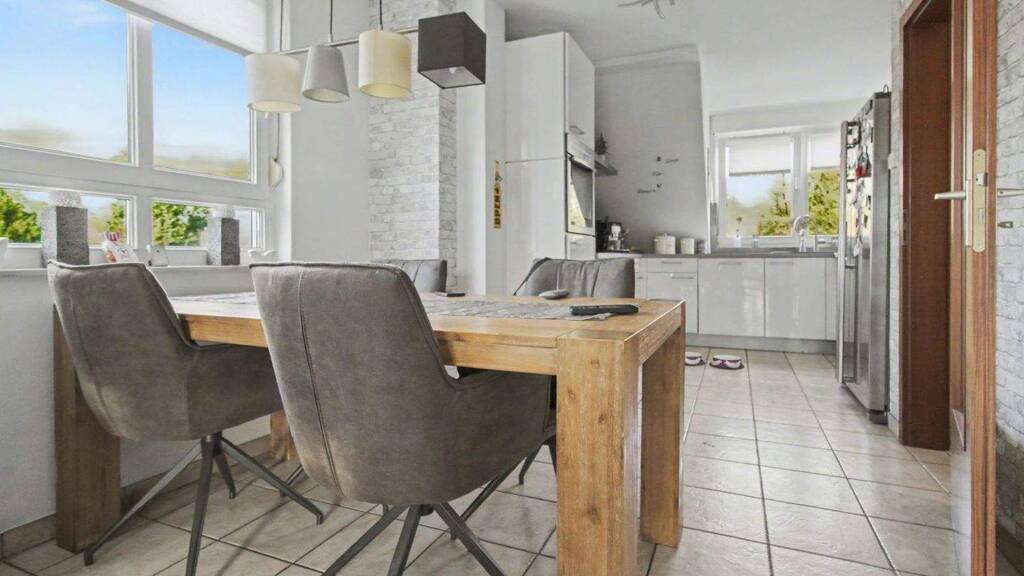 Der Wohnungseingang befindet sich im oberen Geschoss der Maisonettewohnung. Von hier aus eröffnet sich ein kleiner Flur, von dem die offene Küche direkt in den Wohnbereich übergeht. Diese offene Gestaltung schafft ein einladendes, luftiges Wohngefühl und bildet das kommunikative Zentrum der Wohnung. Vom Wohnzimmer aus gelangen Sie auf den sonnigen Balkon, der einen angenehmen Außenbereich für entspannte Stunden bietet. Ebenfalls auf dieser Ebene befindet sich ein praktisches Gäste-WC. Eine Treppe führt vom Flur in das darunterliegende Wohngeschoss.