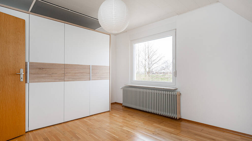 Im Obergeschoss befinden sich zwei kleinere Zimmer sowie ein weiteres, großzügiges Zimmer. Ein zusätzliches Gäste-WC rundet das Raumangebot auf dieser Ebene ab.