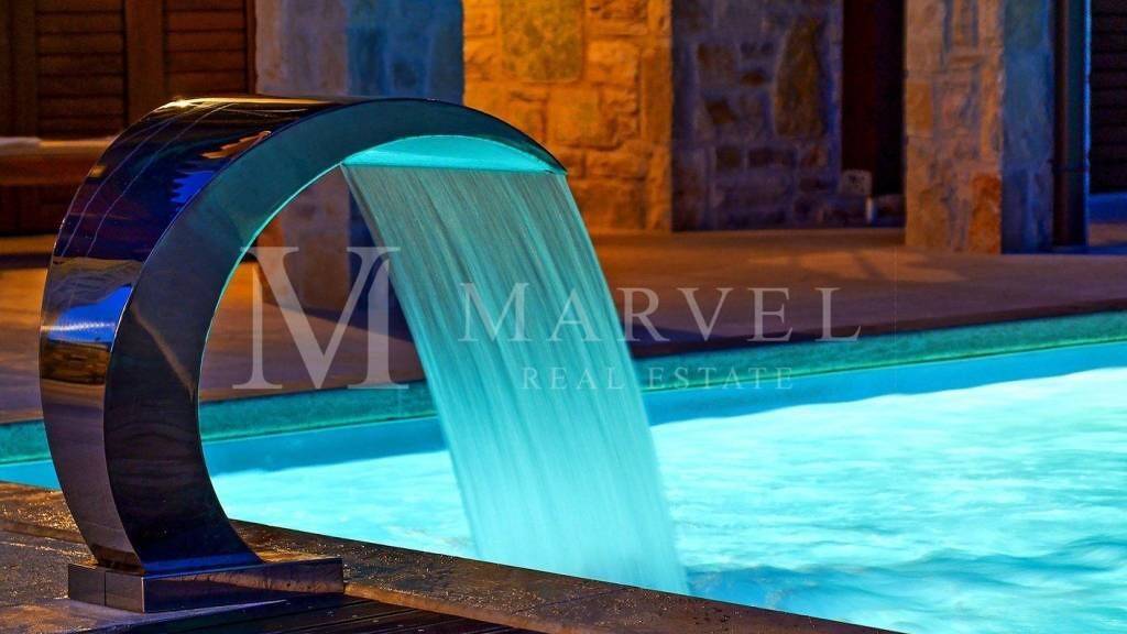 Das Haus wird möbliert verkauft und befindet sich an einem schönen Standort, nur 200 Meter vom Strand entfernt. Der Garten ist sorgfältig gepflegt und umfasst Pools mit Massage-Düsen, überdachte Terrassen, ein Sonnenbereich und einen Grill.