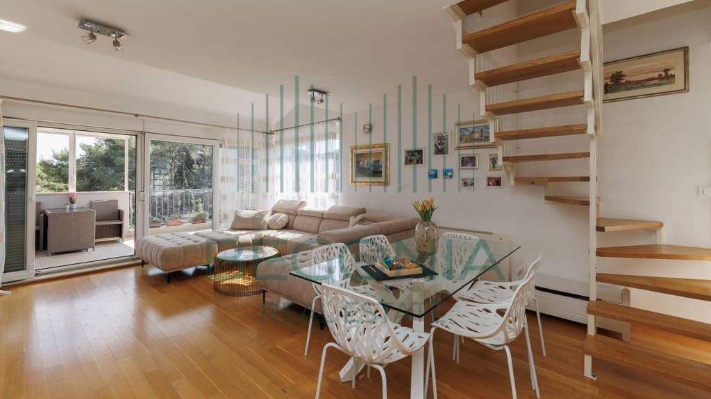 Na prodaju je moderno namjesten dvoetazni stan koji spaja eleganciju i funkcionalnost. Stan se sastoji od prostrane kuhinje s blagovaonicom, udobnog dnevnog boravka, dvije spavace sobe, kupaonice te velike terase koja pruza idealno mjesto za opustanje i druzenje. Grijanje i hladenje osigurano je podnom klimom, sto jamci potpunu ugodnost tijekom cijele godine. Stan raspolaze s dva vanjska parkirna mjesta te jednim garaznim, a nalazi se na izvrsnoj lokaciji u neposrednoj blizini svih vaznih sadrzaja. Ovaj stan predstavlja savrsen spoj modernog dizajna, udobnosti i prakticnosti, idealan za obiteljski zivot ili za one koji zele uzivati u suvremenom prostoru u odlicno povezanom okruzenju