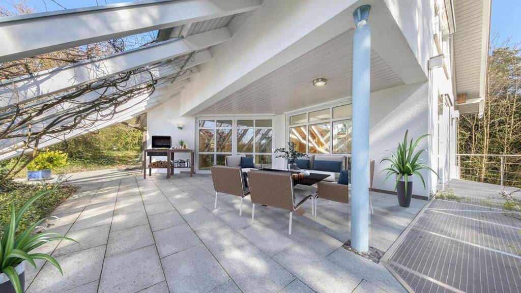 Dieses lichtdurchflutete und vollständig unterkellerte Architektenhaus mit wenigen, besonders großzügig geschnittenen Räumen und zeitloser Architektur in unverbaubarer Südlage direkt am Landschaftsschutzgebiet ist perfekt geeignet für ein Ruhe suchendes Paar mit hohen Ansprüchen, die kleine Familie sowie Freiberufler. Sonnenbeschienene Terrassen und Balkone mit Blick auf parkähnliche Gärten oder ausgedehnte Spaziergänge in Feld und Wald in unmittelbarer Nähe versprechen Entspannung pur.