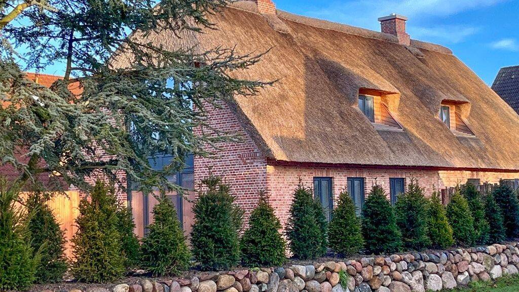 Hochwertig ausgebaute Doppelhaushälfte unter Reet mit Terrasse und Carport auf landschaftstypischem Grundstück, umgeben von einem Friesenwall