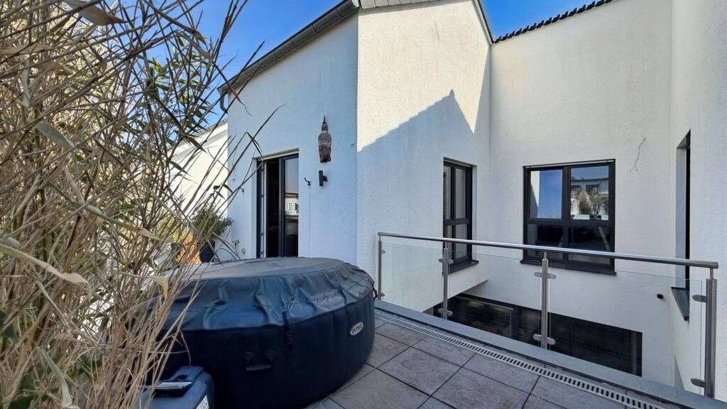 Ergänzt wird das Raumangebot durch eine großzügig konzipierte Dachterrasse. Die statisch verstärkte Konstruktion ermöglicht die Installation eines Whirlpools und schafft einen privaten Rückzugsort mit besonderem Komfort.