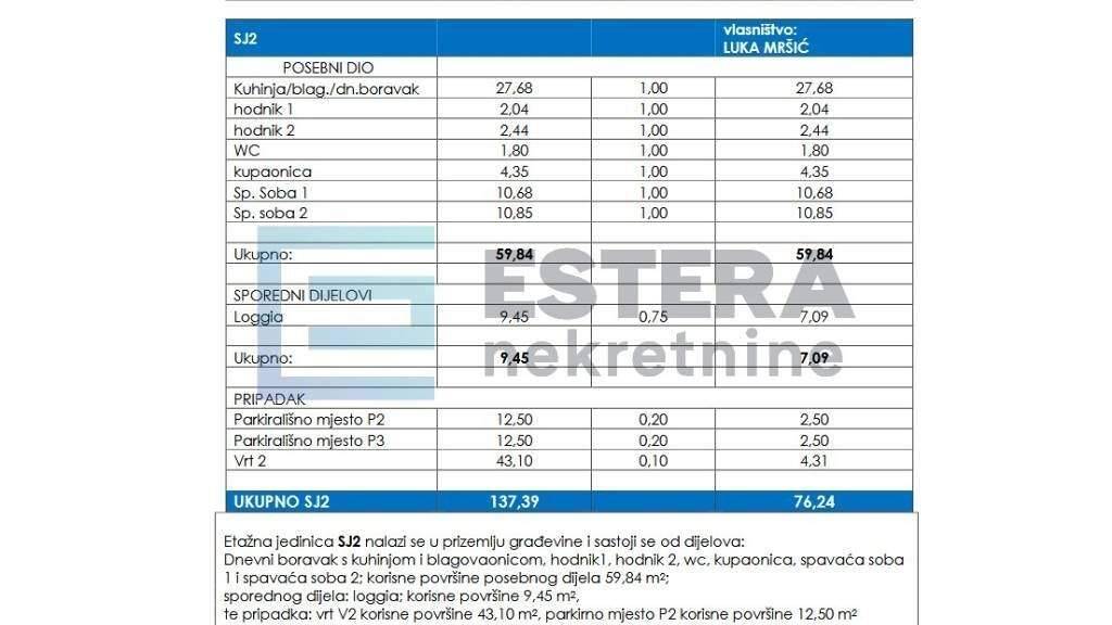 te pripadka: vrt V2 korisne povrsine 121 m2, parkirno mjesto P3 korisne povrsine 12,50 m2 i parkirno mjesto P4 korisne povrsine 12.50 m2.