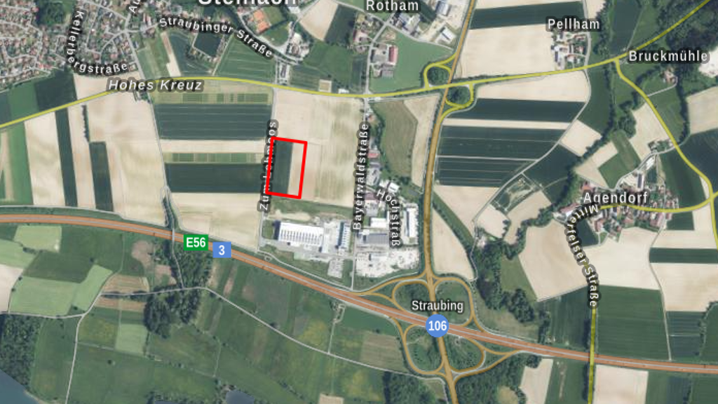 Das Gewerbegrundstück mit einer Gesamtfläche von ca. 27.600 m² (teilbar ab ca. 2.000 m²) befindet sich in 94377 Steinach nahe Straubing. Die Auffahrt auf die Bundesstraße und Autobahn liegt nur wenige Hundert Meter entfernt.