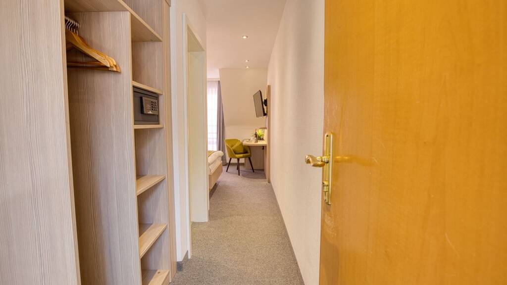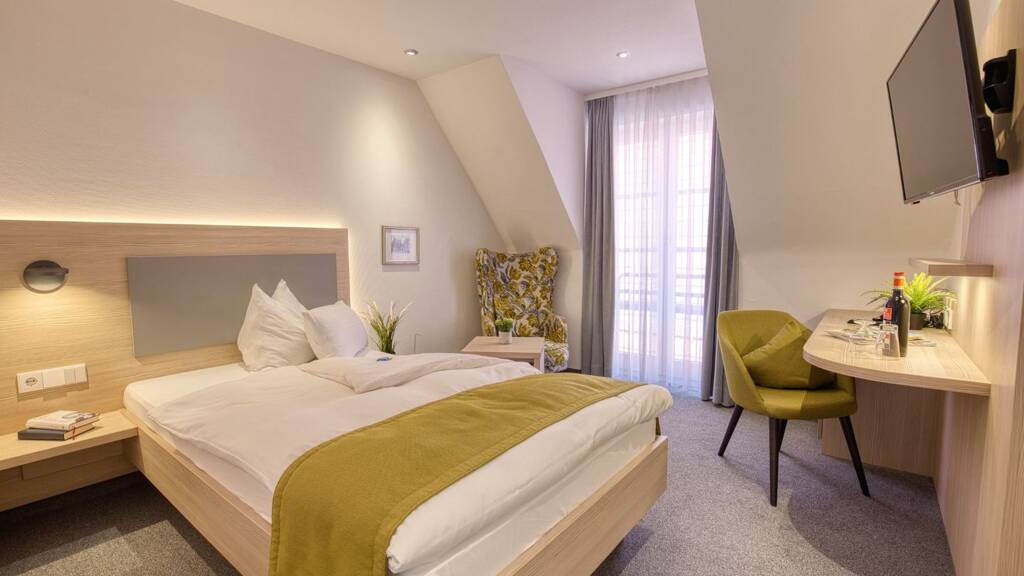 Das Zimmer ist clever eingerichtet und bietet erstaunlich viel Platz. Im Mittelpunkt steht das große Doppelbett (180 cm) - perfekt zum Ausschlafen, Lesen oder einfach zum Runterkommen nach einem langen Tag. Dazu gibt's einen Schreibtisch, an dem du arbeiten, essen oder einfach chillen kannst. Ein gemütlicher Sessel und kleine Pflanzen sorgen für einen Hauch Zuhause, auch wenn du beruflich unterwegs bist.