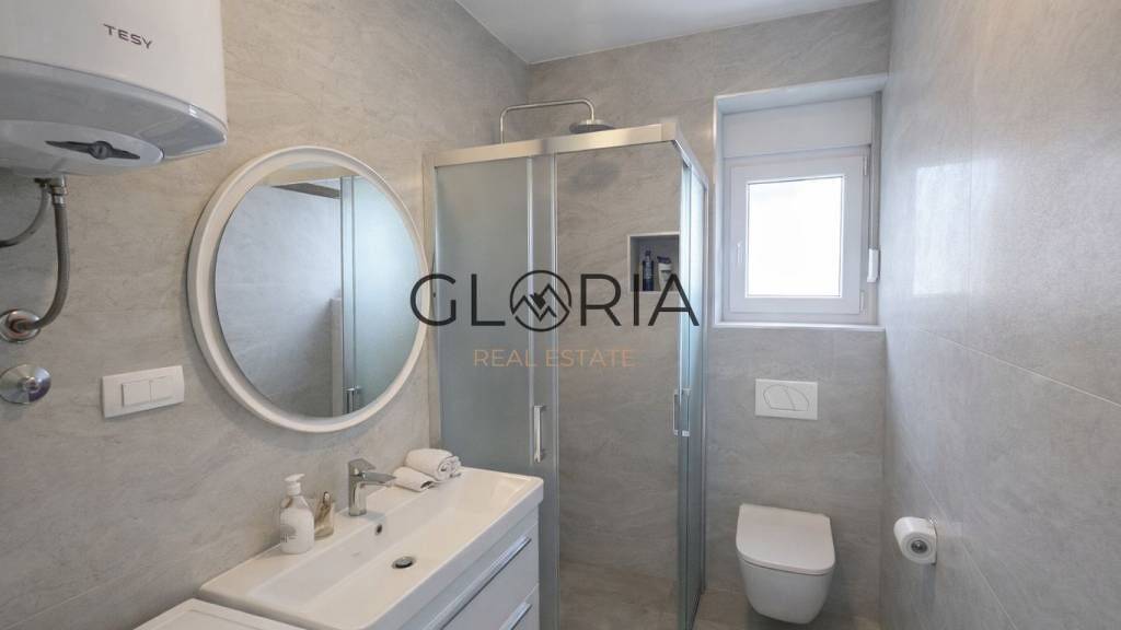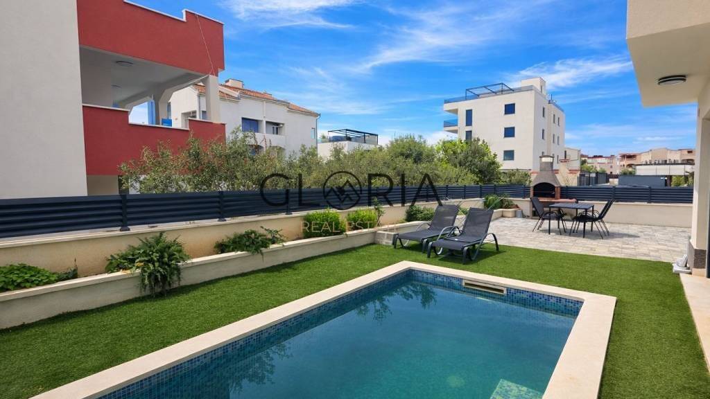 Na prodaju je moderan 2-sobni stan s vlastitim bazenom i vrtom, smjesten u prizemlju novije stambene zgrade koja broji svega 3 etaze i 6 stambenih jedinica u Okrugu Gornjem.