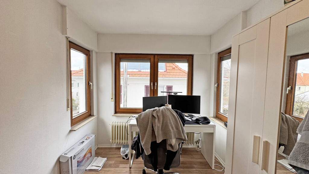 Neuwertige Gas-Zentralheizung, neue Fenster mit 3-fach Verglasung und Rollläden (Einbau 2026), Laminat- und Fliesenböden, Einbauküche mit elektrischen Geräten, Bad mit Dusche, Waschbecken, WC sowie Gäste-WC in 2017 komplett erneuert, Dachterrasse und 2 Balkone, Hausmeisterservice, Carport.