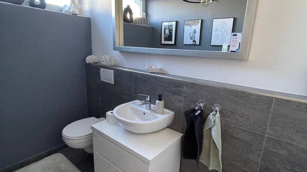 Der in Wohnraumqualität (ebenfalls FBH) ausgebaute große und helle Hobbyraum mit großzügiger Abböschung ist ideal für Homeoffice und vielseitig nutzbar. Alle Räume sind mit hochwertigen, modernen Feinsteinzeugfliesen ausgestattet. Eine Garage und 2 Stellplätze runden das Angebot ab.