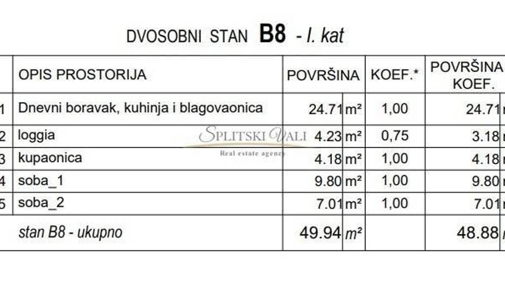 Stan se sastoji od dnevnog boravka s kuhinjom i blagovaonicom, dvije spavace sobe, kupaonice i loggie povrsine 4,23 m. Ukupna obracunska povrsina iznosi 48,88 m. Tlocrt i detaljna specifikacija nalaze se u slikama oglasa.