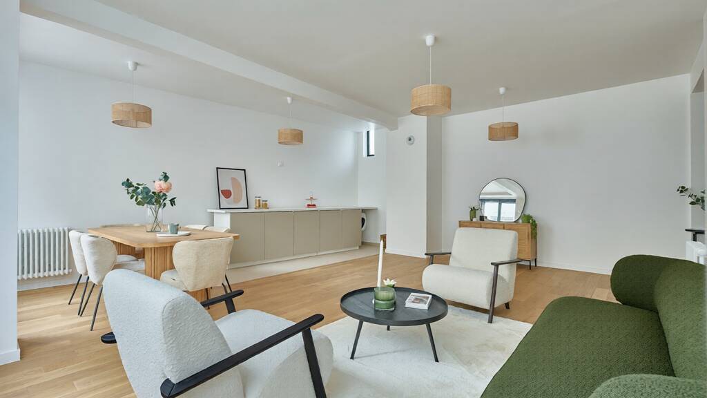Set back from the hustle and bustle of the neighborhood, it offers a peaceful living environment in the heart of a central and sought-after area. From the entrance, the 50 m2 living area unfolds around the living room, dining room, and open-plan kitchen. Large windows enhance the space, bringing light and character to the entire area.