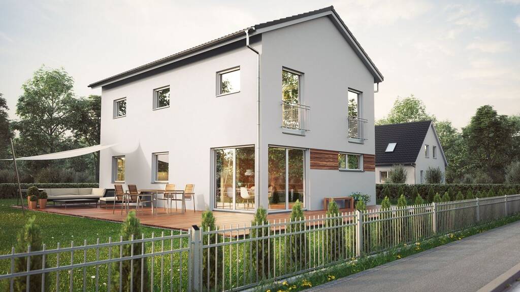 Modernes Wohnen auf zwei Ebenen. Dabei sorgen die großen Fenster für lichtdurchflutete Zimmer in Ihrem neuen Traumhaus.