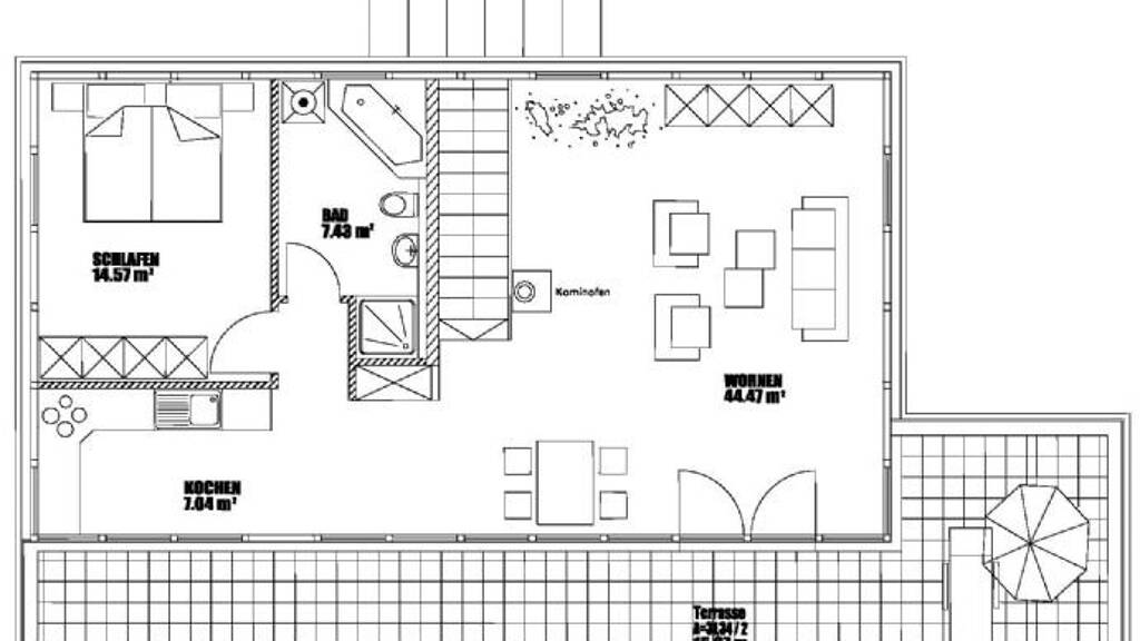 Die Bereiche Küche, Essplatz und Wohnbereich, sind in einer Wohnoase zusammengefasst, von der aus Sie auf die sehr gepflegte Dachterrasse gelangen. Die Dachterrasse besitzt eine Glasüberdachung.