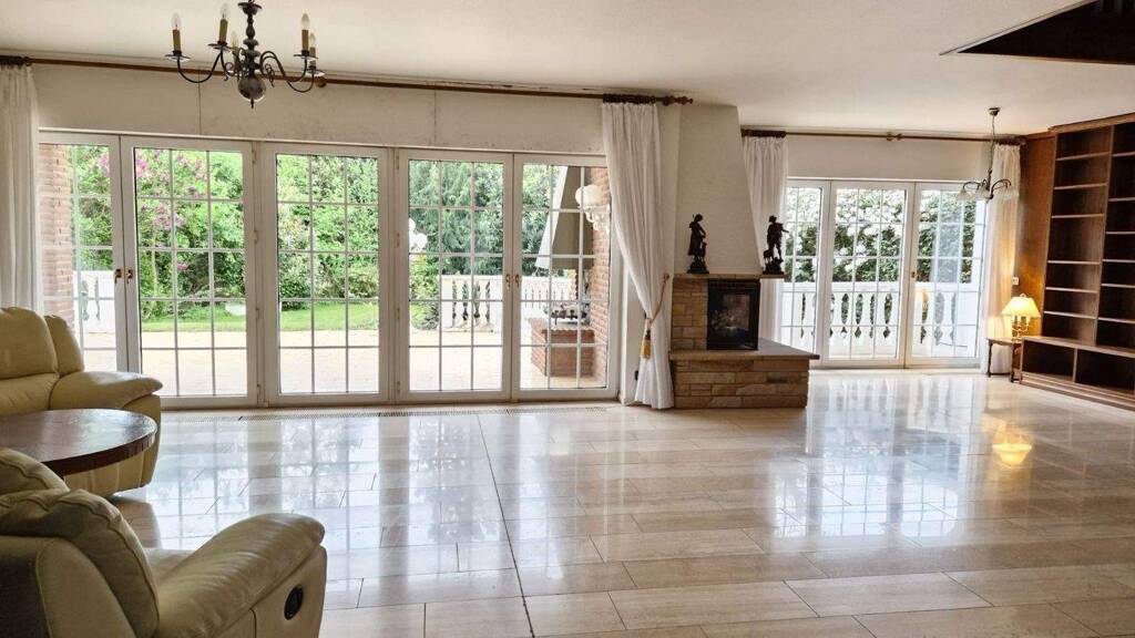 Die Wohnfläche von insgesamt 196 m² verteilt sich auf das Erd- und Dachgeschoss. Die einladende Eingangstür führt in den vertäfelten Windfang. Über eine Diele betritt man das Esszimmer und befindet sich danach im großzügigen offenen Wohnbereich mit Panoramafenstern und Kaminecke. Dieser lichtdurchflutete Wohnbereich ermöglicht Wohnen auf hohem Niveau. Panoramafenster leiten auf eine große Terrasse mit offenem Kamin. Von dort genießt man den phantastischen Blick in den schönen Garten. Über die exklusive, massive Holztreppe mit integriertem Bücherregal gelangt man ins Dachgeschoss, in dem sich zwei Schlafzimmer und ein Tageslichtbad mit Badewanne, Dusche, WC und zwei Waschbecken befinden.