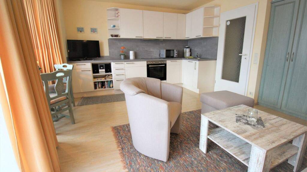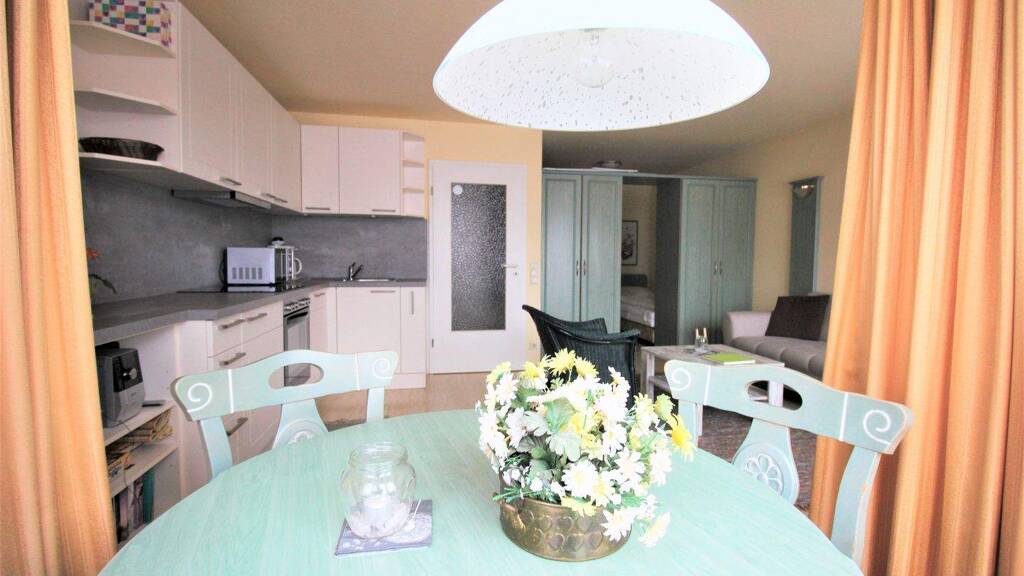 Die Fläche innerhalb des Appartements ist sinnvoll genutzt. Der helle Wohn-/ Schlafraum ist gemütlich eingerichtet und verfügt über eine Sitzecke, einen Essplatz im lichtdurchfluteten Erker sowie den Zugang zum Westbalkon. Die voll ausgestatte Küchenzeile ist in den Wohnraum integriert. Der offene Schlafbereich ist durch zwei Schränke räumlich abgegrenzt und mit zwei Einzelbetten ausgestattet. Das innenliegende Duschbad ist in hellen Farben gehalten und geht vom Flur ab. Die Wohnung befindet sich in einem guten gepflegten Zustand.