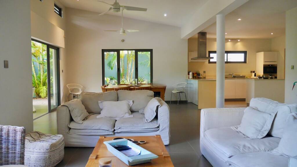 Der gestaltete Außenbereich ist für Entspannung und einfache Wartung konzipiert. Das private Schwimmbecken bildet den Mittelpunkt des Gartens und schafft eine ruhige tropische Atmosphäre. Ein neu renovierter Kiosk bietet einen idealen Raum für Außenversammlungen, während ein spezieller Lagerraum praktischen Platz für Wassersportausrüstung bietet. Die Villa befindet sich in sehr gutem Zustand und ermöglicht eine sofortige Nutzung ohne weitere Investitionen. Es wird voll möbliert verkauft, mit sorgfältig ausgewählten Stücken, die lokal auf Mauritius bezogen werden und einen zeitgenössischen tropischen Stil widerspiegeln. Eine Erweiterung des Wohnraums um ein viertes Schlafzimmer ist möglich, was zusätzliche Flexibilität und langfristiges Wertpotenzial bietet. Ein Generator und ein Wasserreservierungssystem sorgen für zusätzliche Unabhängigkeit und Komfort. Die Residenz wird professionell verwaltet.