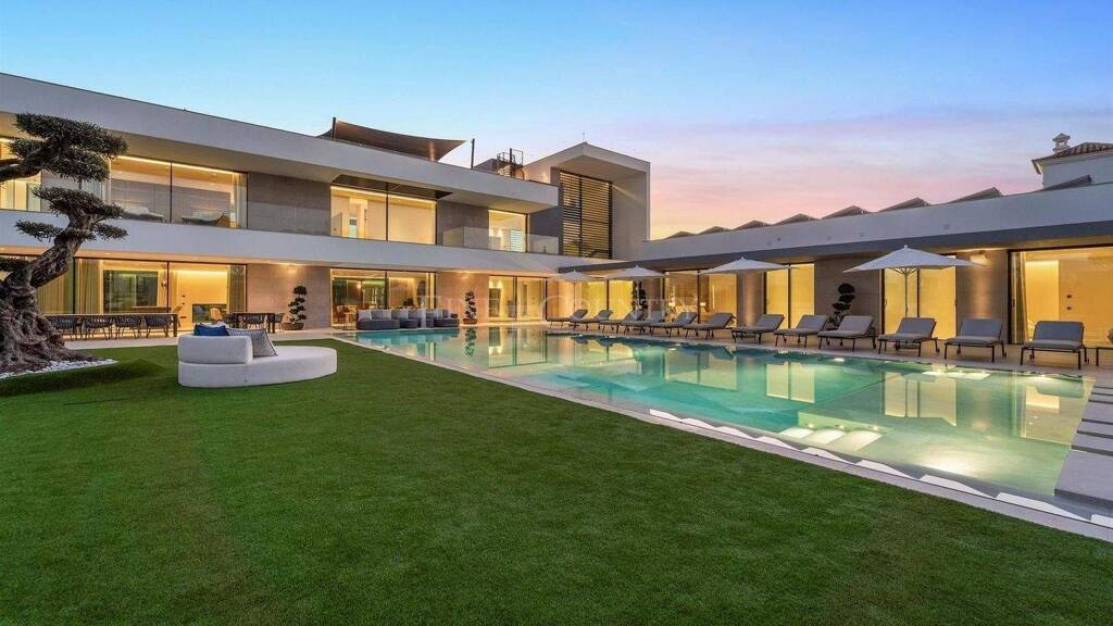 Die Villa erstreckt sich über drei Hauptetagen, die alle bequem mit einem Aufzug erreichbar sind, und empfängt Sie mit einer beeindruckenden Eingangshalle mit doppelter Raumhöhe. Das Erdgeschoss verfügt über einen großzügigen offenen Wohn- und Essbereich mit doppelseitigem Kamin, eine moderne, voll ausgestattete Küche mit Kochinsel sowie eine separate Serviceküche. Zudem befinden sich auf dieser Ebene ein Büro mit Duschbad und drei geräumige Schlafzimmer en suite, alle mit direktem Zugang zur Poolterrasse und den Außenbereichen.