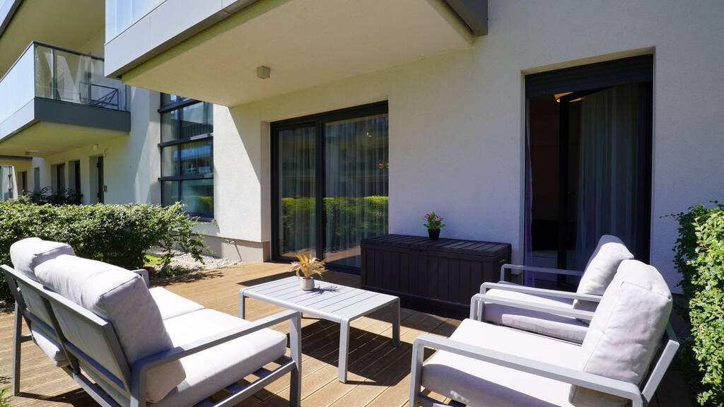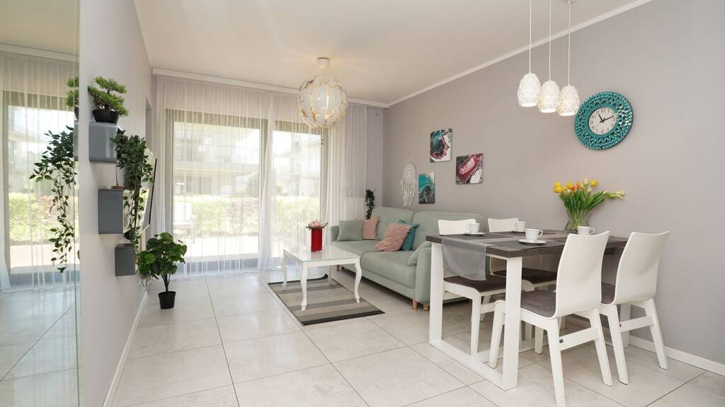 WAS BEKOMMEN SIE? 38 m² gemütliche Wohnung im Gardenia-Komplex in Dziwnów Separates Schlafzimmer (d.h. Sie schlafen nicht mit dem Kühlschrank) mit großem Schrank Wohnzimmer mit Küchenzeile (ideal für Netflix und Pizza), Geschirrspüler, Mikrowelle und andere Annehmlichkeiten Badezimmer mit Dusche und Waschmaschine – alles nagelneu, ordentlich, bezugsfertig 30 m² privater Garten mit Meerblick – wirklich, hier können Sie Liegestuhl, Hängematte, Schaukel, Mini-Palme, Hund, Katze oder alles zusammen haben Parkplatz im Tiefgaragenstellplatz – somit kein Kampf um einen Platz in der Saison – zusätzlich 39.000 PLN