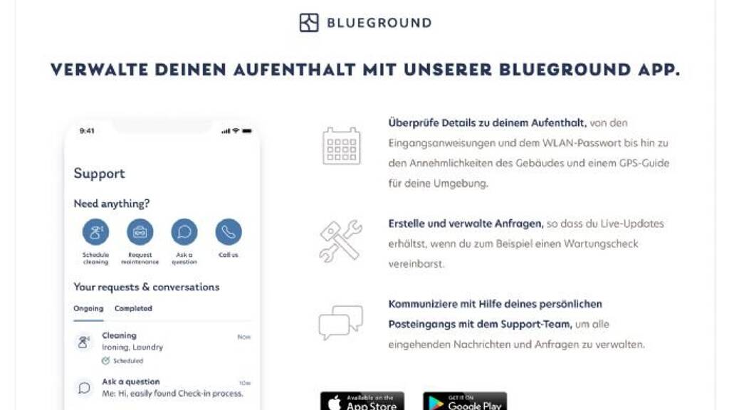 Während Ihres Aufenthalts haben Sie über die Blueground-App Zugriff auf unser Customer Experience-Team. Sie können zusätzliche Reinigungsarbeiten planen, Wartungsanfragen einreichen und unsere Nachbarschaftempfehlungen mit nur wenigen Fingertipps anzeigen.