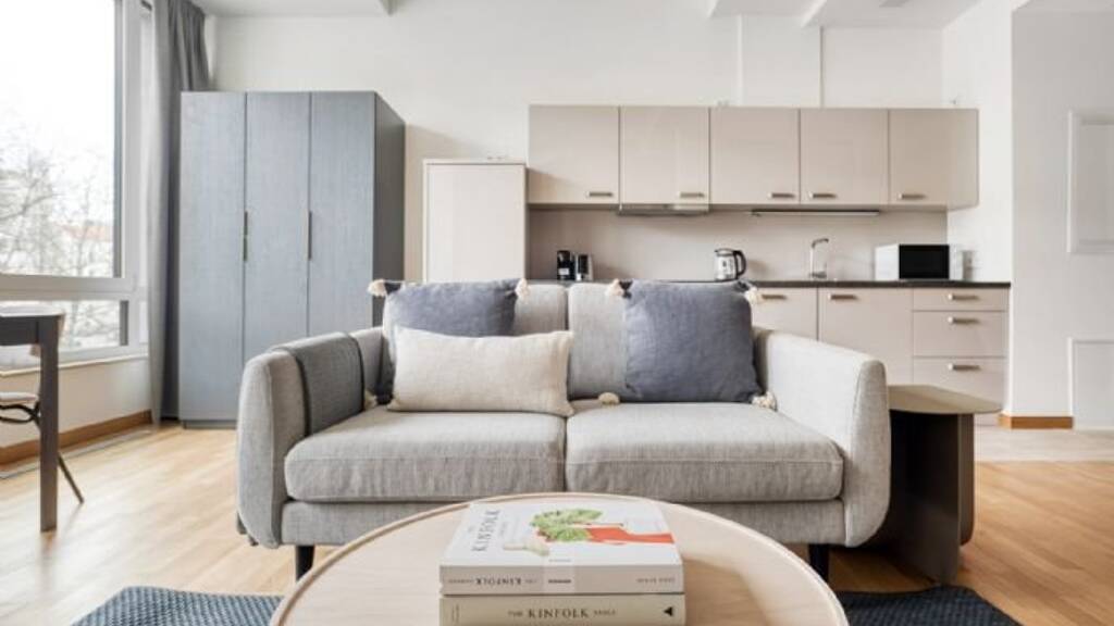 Wie bei jedem Blueground Wohnung finden Sie einen durchdacht gestalteten Raum mit schönen Möbeln. und eine voll ausgestattete Küche in diesem Studio Immobilie. Und dank unserer hochwertigen Matratzen können Sie sich entspannen, weil Sie sich immer wie zu Hause fühlen werden. Wenn Sie Lust auf etwas Spaß haben, können Sie die Berlin -Atmosphäre genießen oder sich die Unterhaltung mit dem kabellosen Premium-Lautsprecher oder dem Smart-TV direkt nach Hause holen.