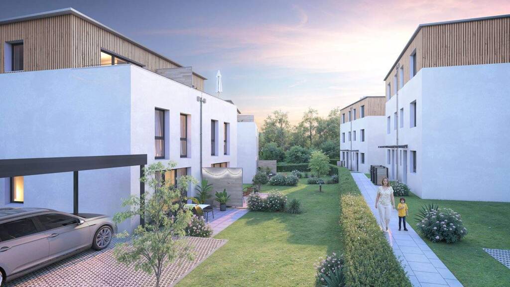 Dank einer zeitgemäßen Grundrissplanung bekommt Ihr ein wohnliches und praktisches Eigenheim. Aufgrund flacher und begrünter Dächer sind auch die oberen Stockwerke ohne Dachschrägen nutzbar. Außerdem kalkulieren wir clevere Abstellmöglichkeiten und Stauräume ein, sodass keine zusätzliche Investition für einen Keller eingeplant werden muss. Pro Eigenheim stehen zwei Außenstellplätze was dazu erwoben werden kann. Durch Contracting von Photovoltaik-Anlagen und Wärmepumpen erfüllen die gekennzeichneten Häuser den Anspruch an ein KfW-Effizienzhaus 40 QNG-Klasse und sorgen so für nachhaltiges und kostengünstiges Wohnen.