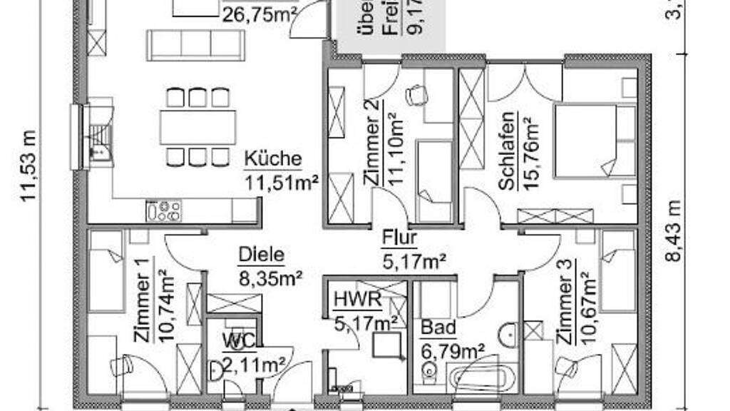 einen überdachten Hauseingang. Raumaufteilung Der Bungalow hat 5 Zimmer inkl Gäste WC.