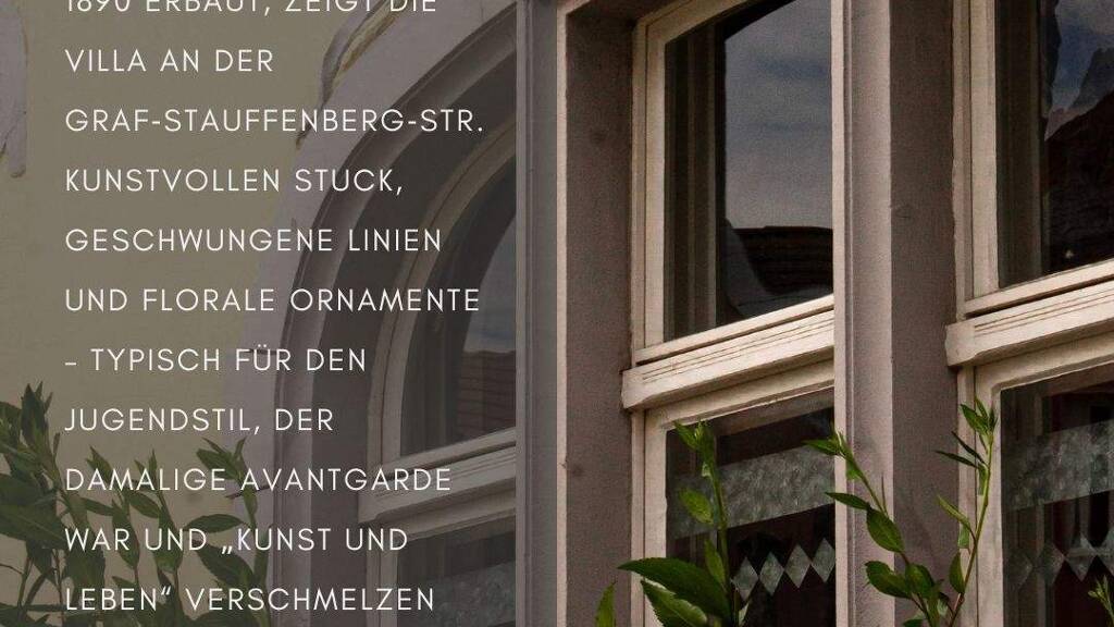 1890 erbaut, präsentiert sich die Villa an der Graf-Stauffenberg-Straße mit kunstvollem Stuck, geschwungenen Linien und floralen Ornamenten - klassische Elemente des Jugendstils. Eine Epoche, in der Architektur mehr sein wollte als Funktion: Sie sollte Kunst und Leben miteinander verbinden.