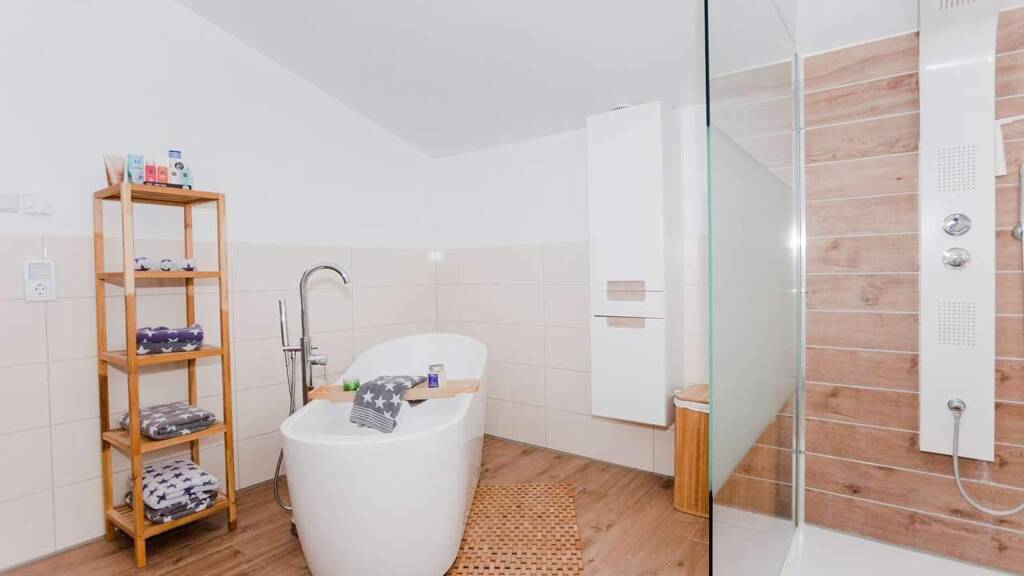 Das große Schlafzimmer geht über in die eigene Ankleide und dann als Highlight, Euer eigenes großes Badezimmer inklusive offener Dusche und Badewanne.