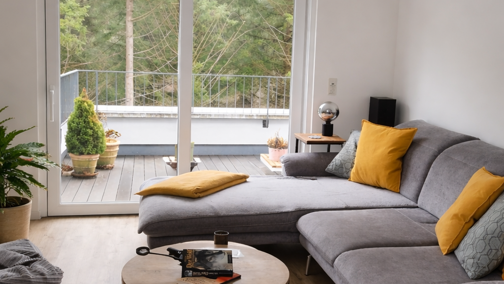 Dank der großen Fensterfront im Wohn- und Küchenbereiches besteht jeweils einen direkten Zugang zur umlaufenden Dachterrasse. Hier genießen Sie die frische Luft in aller Ruhe.
