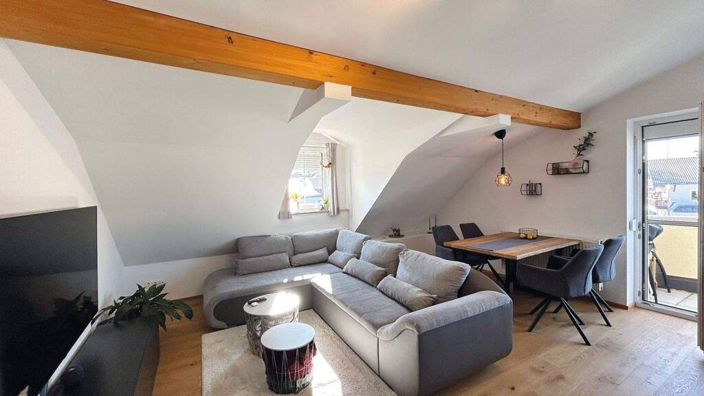 Bereits beim Betreten der Wohnung spürt man den besonderen Charme, den die Dachschrägen und die offene Gestaltung vermitteln. Der Wohn- und Essbereich präsentiert sich hell und freundlich - ideal, um zur Ruhe zu kommen oder Gäste zu empfangen. Von hier aus gelangen Sie direkt auf den Balkon, wo Sie ungestörte Stunden im Freien genießen können. Ob ein Kaffee am Nachmittag oder ein Glas Wein bei Sonnenuntergang - dieser Platz wird schnell zu Ihrem persönlichen Lieblingsort.