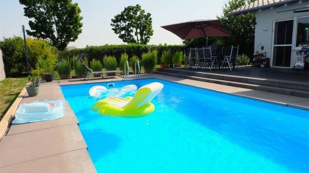 Ein Haus mit besonderer Ausstattung und Ambitionen für 4 Jahreszeiten: Frühlingsblüten für den Frühling, Swimmingpool für den Sommer, Grünblick für den Herbst und Kachelofen für den Winter.