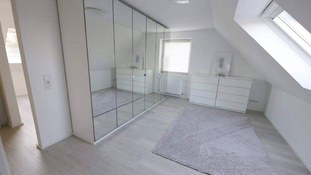 Ein echter Hingucker ist die neu angelegte Treppe in moderner Betonoptik, die Sie auf die Galerie im Obergeschoss führt. Dort angekommen erreichen Sie den Flur, von wo aus insgesamt vier Schlafzimmer, ein weiteres Bad und ein kleiner Abstellraum abgehen. Besonders hervor sticht das größte Schlafzimmer mit rund 34 m² Fläche, der Fensterfront und dem anschließenden Balkon. Letzterer bietet einen herrlichen Blick über den Garten und die Felder bis hin zum Hermannsdenkmal, wodurch eine reizvolle Aussicht und ein tolles Ambiente entstehen. Das Tageslichtbad auf dieser Etage ist mit einer großen bodentiefen Dusche und einem Doppelwaschtisch ausgestattet. Die Gestaltung mit besonders großen glänzenden Marmorfliesen verleiht dem Bad eine luxuriöse und zugleich moderne Optik.
