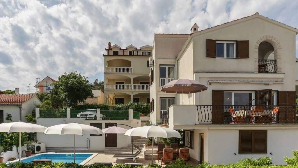 Dieses Haus mit einer Fläche von 220 m2 wurde auf dem Grundstück von 600 m2 gebaut. Es erstreckt sich über drei Etagen. Im Erdgeschoss befindet sich ein 1-Zimmer Appartement von 22 m2. Im ersten Stock ist eine grosse 1-Zimmer Wohnung von 80 m2. Diese Wohnung besteht aus geräumigem Wohnzimmer mit Küche und Essraum, Schlafzimmer, Bad und Terrasse von 30 m2 mit Panoramablick. Es ist möglich noch einen Schalfzimmer zu haben. Im zweiten Stock befindet sich eine schöne 2-Zimmer Wohnung von 73 m2, die aus Wohnzimmer mit Küche und Essraum, zwei Schlafzimmern, einem Badezimmer und schöner Terrase von 19 m2 besteht. Vor dem Haus steht ein Pool mit Terrasse, Dusche und einem Raum von 25 m2. Das Haus ist umgeben vom schönen mediterranen Garten mit dem Grillkamin. Zu dem Haus gehört ein Parkplatz für vier Wagen. Es ist 100 m vom Meer entfernt. Infrastruktur: Zufahrt, Strom, Wasser, Kanalisation