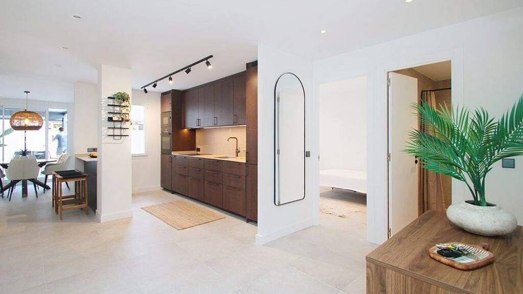 Das durchdachte Raumkonzept umfasst zwei Doppelschlafzimmer und zwei Badezimmer, davon eines en Suite. Der offene Wohn- und Essbereich mit integrierter Einbauküche überzeugt durch ein harmonisches Designkonzept mit warmen Naturtönen, hochwertigen Steinoberflächen und eleganten Holzelementen.