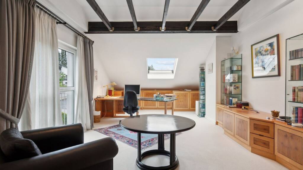 Dachgeschoss Eine weitere Treppe führt ins Dachgeschoss. Hier befindet sich ein großer Raum, der derzeit als Büro genutzt wird, aber sich in zwei Zimmer aufteilen lässt. Ein Schlafzimmer mit Zugang zum eigenen Bad, das großzügig geschnitten und gut ausgestattet ist. Diese Etage hat einen Flur, von dem alle Räume zugänglich sind.
