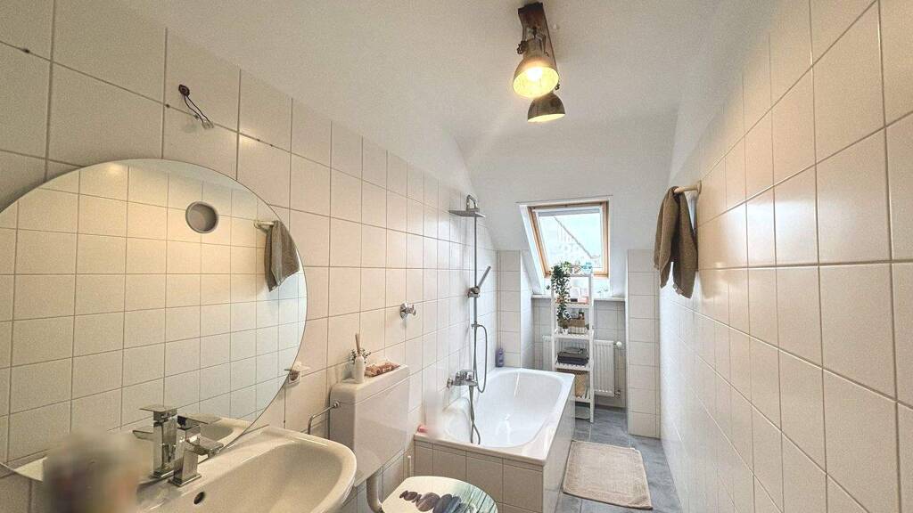 Die Dachgeschosswohnung verfügt über zwei gut gestaltete Zimmer und einen Waschmaschinenanschluss im Bad.