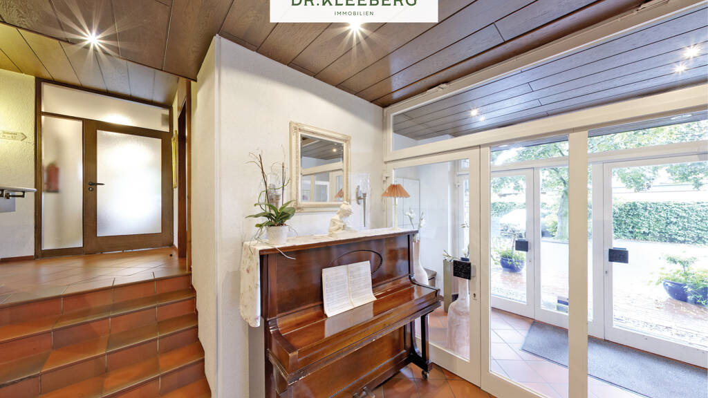 Über eine überdachte Außentreppe erreicht man das Obergeschoss und gelangt zunächst in den zentralen Flur, der die verschiedenen Wohnbereiche miteinander verbindet. Auf der linken Seite befindet sich eine eigenständige Wohneinheit, die durch einen großen Wintergarten besticht. Diese Einheit umfasst ein geräumiges Schlafzimmer, eine funktionale Küche sowie ein großzügiges Wohnzimmer, das viel Platz bietet. Ein zusätzliches Büro, das auch als Gästezimmer genutzt werden kann, sowie ein Badezimmer runden diesen Bereich ab.