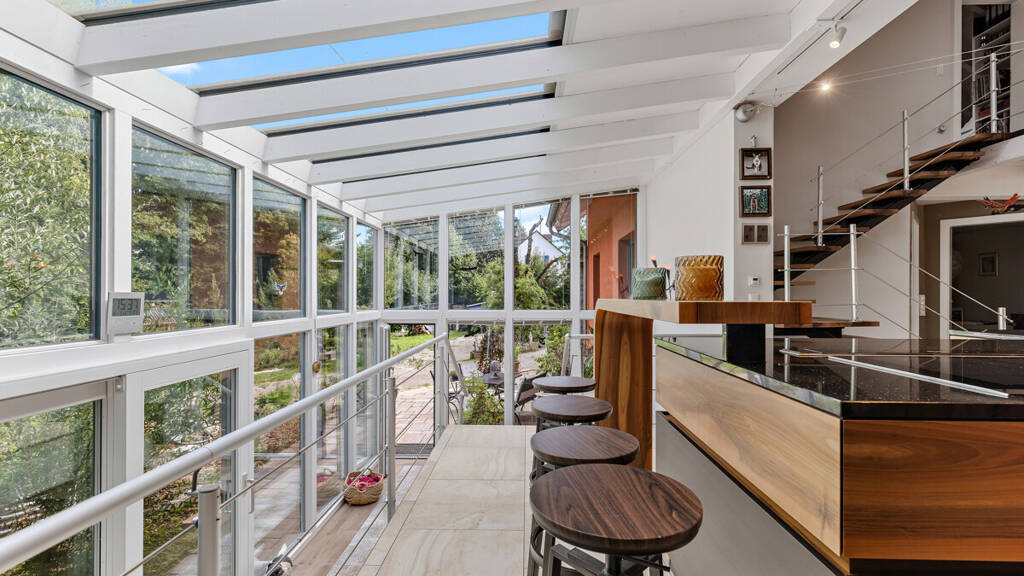 Der weitläufige Wohnbereich vereint erstklassigen Wohnkomfort mit klarer, zeitloser Ästhetik. Ein angrenzender Wintergarten erweitert die Wohnfläche und bietet zu jeder Jahreszeit einen herrlichen Blick ins Grüne. Hochwertige Materialien und eine klare Linienführung prägen die exklusive Ausstrahlung des gesamten Hauses.