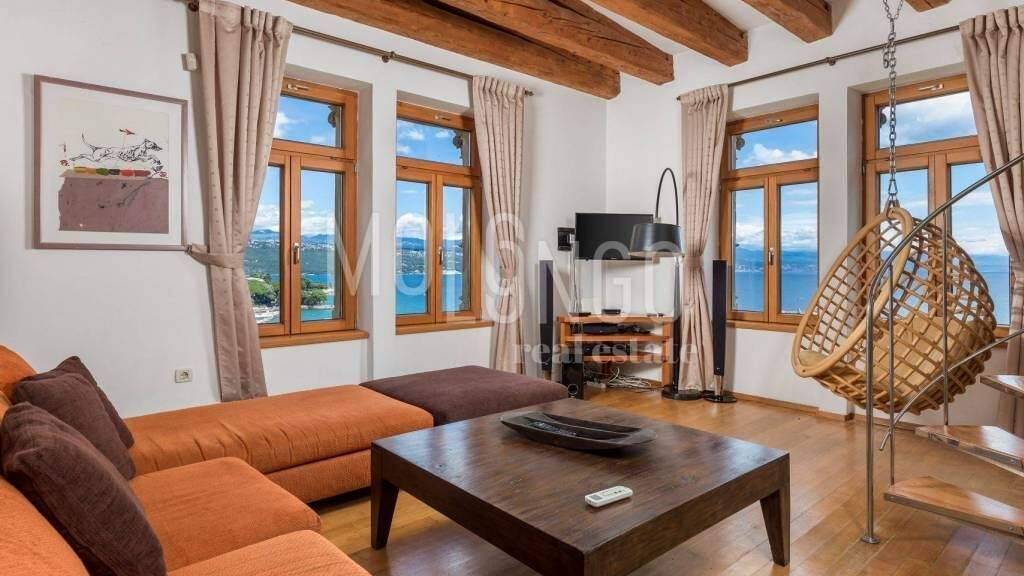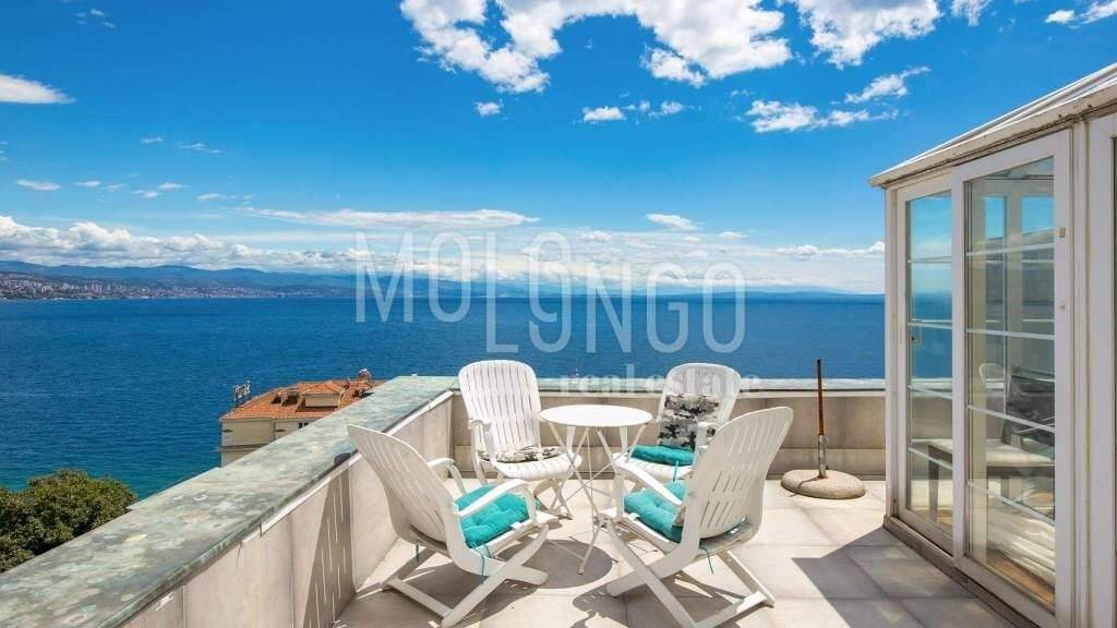 Geräumige Wohnung im dritten Stock eines gepflegten Gebäudes im Herzen von Opatija mit atemberaubendem Blick auf Opatija und die gesamte Kvarner Bucht. Dank der ausgezeichneten Lage und der höheren Etage ist die Wohnung sehr hell und bietet ein angenehmes Gefühl von Raum und Privatsphäre.