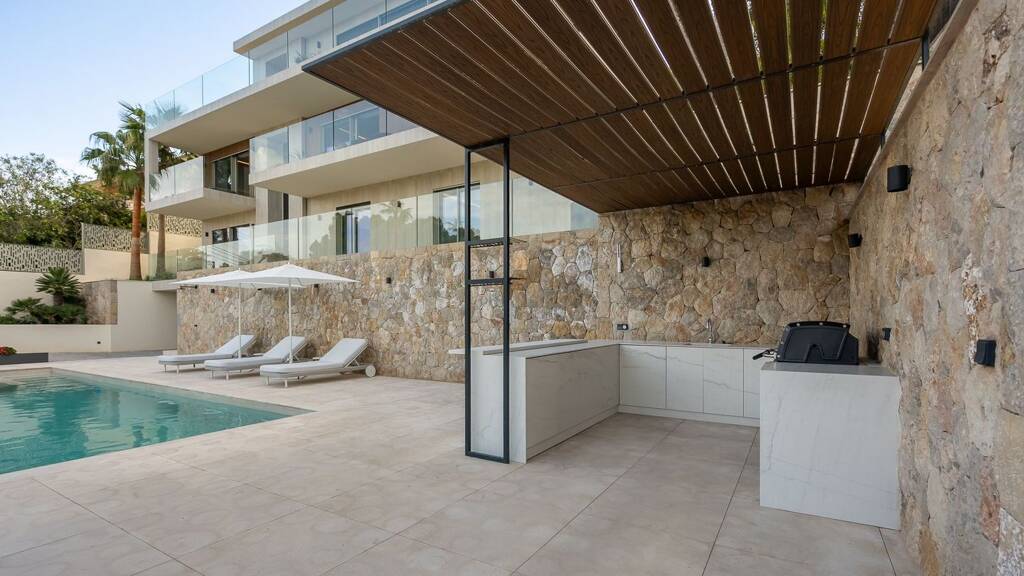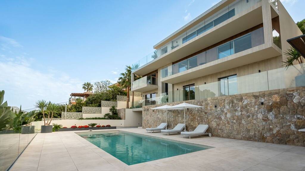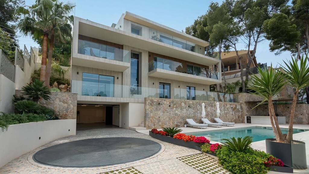 Diese atemberaubende Villa mit Meerblick wird gerade eindrucksvoll renoviert und auf den Standard eines neuen, erstklassigen Gebäudes gebracht. Privatsphäre und atemberaubende Ausblicke sind durch die erhöhte Lage garantiert. Ein Aufzug, der alle Ebenen miteinander verbindet, macht die Villa leicht zugänglich. Eine Drehscheibe erleichtert das Parken in der 50 Quadratmeter großen oberen Garage. Die Innenaufteilung maximiert die Sichtlinien und verbindet modernes Design mit mallorquinischem Charme. Auf der Wohnebene befinden sich eine Designerküche und ein Wohnzimmer, die beide einen atemberaubenden Blick auf das Meer bieten. Drei Schlafzimmer mit eigenem Bad und ein vielseitiges Untergeschoss mit einem weiteren Schlafzimmer sorgen für zusätzlichen Komfort. Zu den luxuriösen Extras gehören Fußbodenheizung, Klimaanlage, ein Fitnessraum und drei Garagenplätze.