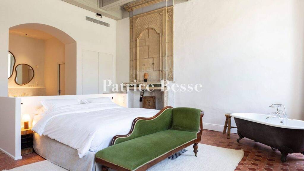 This stately home, which was built in several stages, has been tucked away for 600 years in a Provence village, through which flow two waterways, and is framed to the east, west and south by three very quiet small streets. The previously omnipresent basketwork activity, helped by the presence of neighbouring waterways, is today still represented by a prestigious and internationally renowned workshop, located not far from the property, which, over time, has experienced a stately, agricultural and now commercial destiny. It was owned by the same family from the 14th to 20th century. The approximately 1,150-m² building complex is very harmonious and is made up of a large residence and a neighbouring, smaller one, formerly used for the domestic staff's quarters and as stables. In the late 20th century, the house was virtually in ruins when a financier fell in love with it, before selling it to the current owners, who completed the restoration of the entire property.