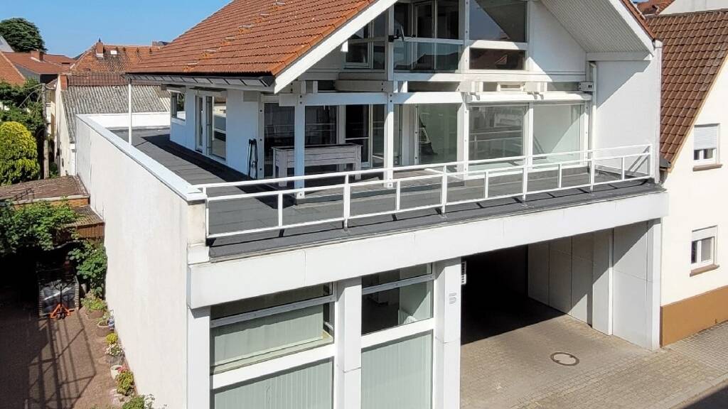 Das Huf-Haus präsentiert sich mit einer großen Dachterrasse, die 2025 komplett saniert wurde. Die Dachterrasse umschließt an drei Seiten das Haus und ist von jeder Seite des Hauses begehbar.